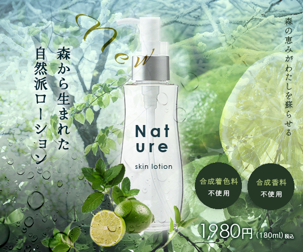 banner 美容液「Nature」 「Nature」という自然派化粧品ブランドがある想定のもと、新製品の美容液がリリースされた時の広告を作成。
