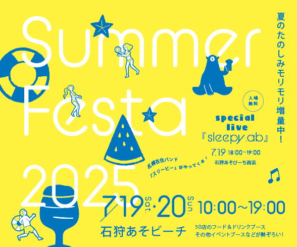 banner Summer Fest 石狩で期間限定のビーチが開かれるという想定のもと制作。夏らしい色合いで楽しい雰囲気を出してみました。